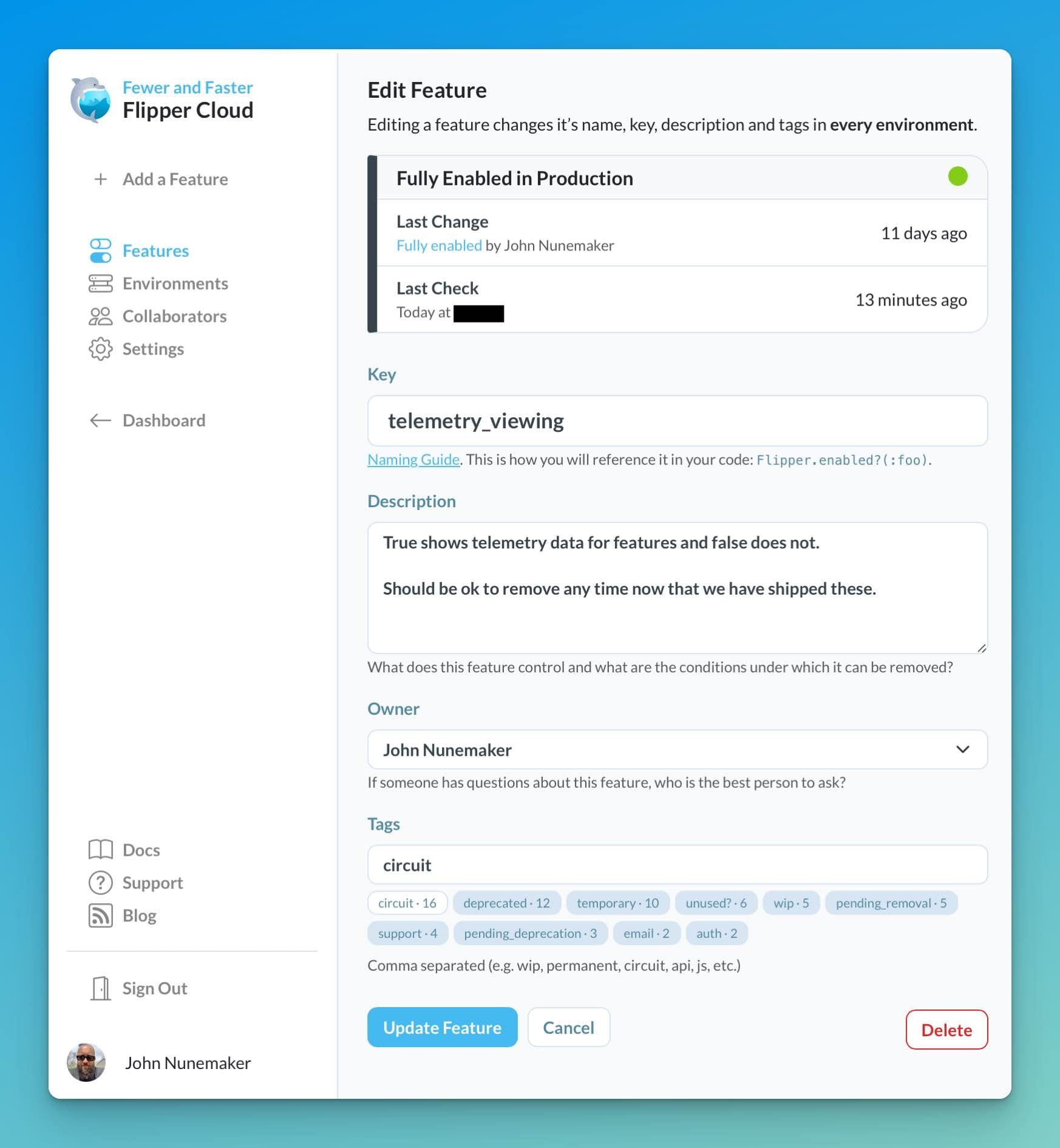 Once the deploy was out, I hopped into Flipper Cloud and renamed the feature from feature_stats to telemetry_viewing.