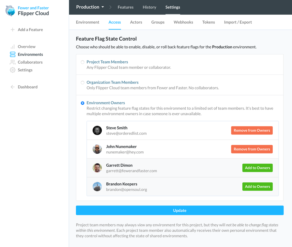 Flipper Cloud now supports restricting shared environments (who can enable, disable, or roll back feature flags). That way nobody accidentally enables a flag in production prematurely. Of course, everyone still receives their own personal development environment that’s fully under their control. They can enable, disable, roll back, or mirror production settings all day long.