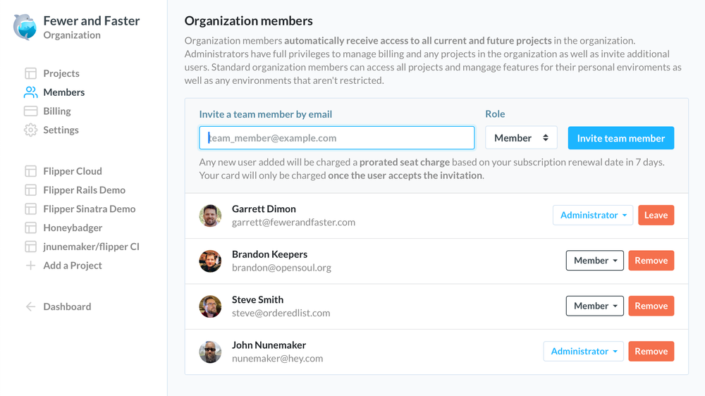 Paying Flipper Cloud customers now have a little more control over which organization members have access to which features. Organization members can be assigned a role of administrator, member, or billing. And even better, there's no charge for billing-only team members.