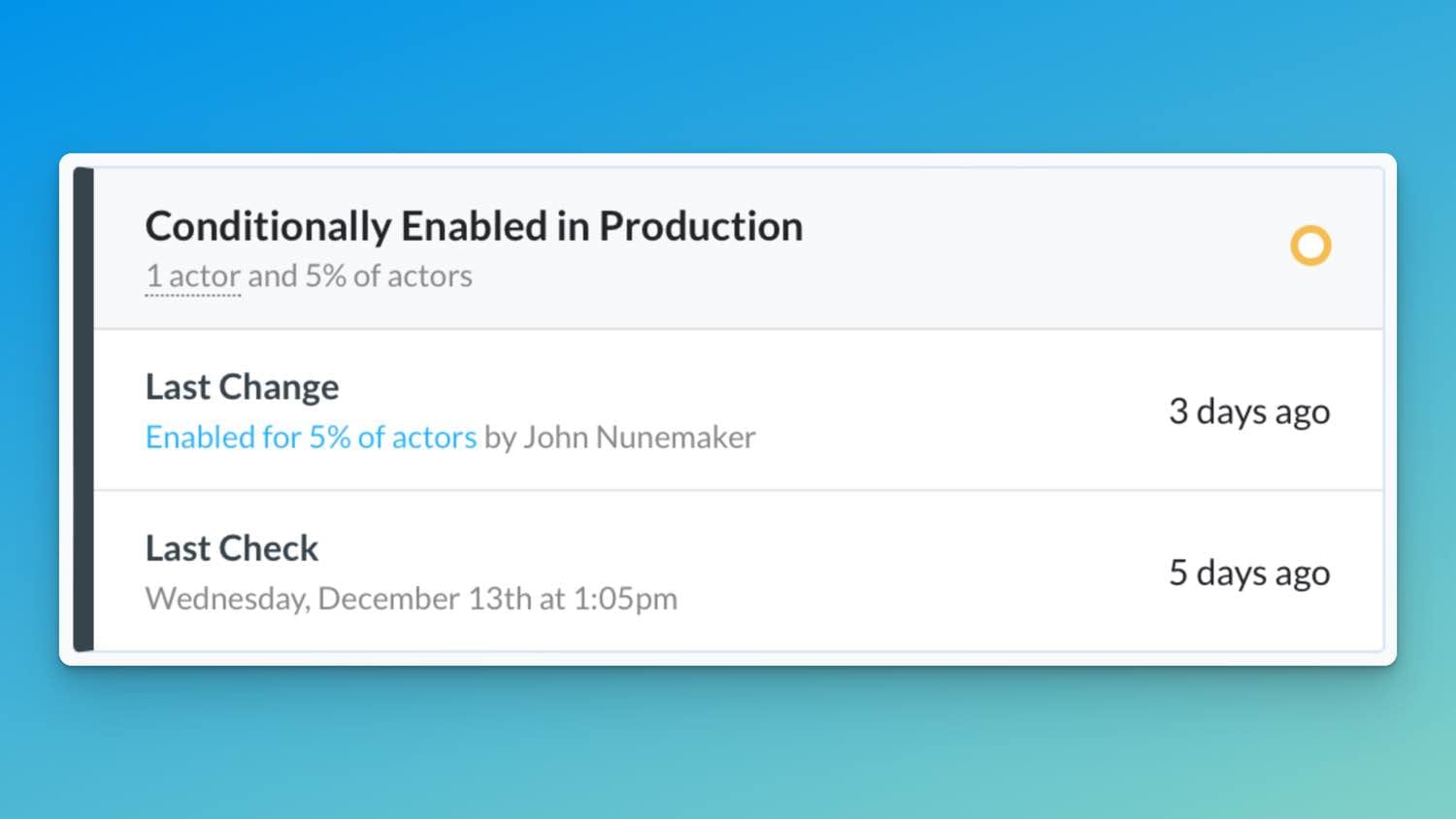 - When was this feature last checked in the last few minutes/hours in production (or any other environment)?