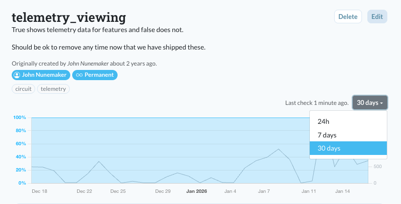 Up until now we've only shown 24 hours of telemetry data even though we've been storing more history. 24 hours was great because that's usually enough to know if a flag is fully removed from the code and ready to be deleted. But sometimes you need a longer time frame, especially in lower traffic applications.